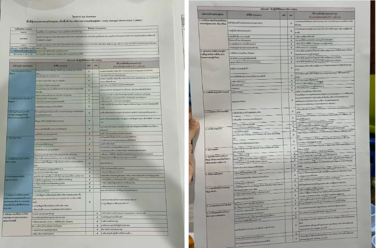 涉及LMMA管理涉及的多个政府部门也都要认可LMMA的管理规则。海洋观察的负责人Tab向我们出示了社区、地方政府和NGO签署的合作备忘录。两张巨大的纸上密密麻麻写满了泰文,都是经过逐条协商、各方都确认的管理细则。仅涉及到社区的就有19个类别,例如:不可独自行动,必须和伙伴合作,伙伴可以是政府部门、NGO,也可以是邻居。