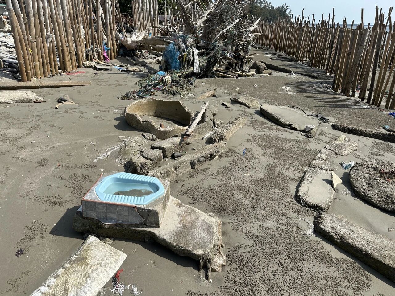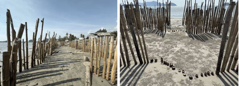 不过村民并没有放弃努力。我们来此地是参观位于废墟和大海之间的几排竹竿。这些竹竿既能降低海浪的能量,也能拦住沙子。原本政府想建一条水泥墙用于防波,但当地人觉得水泥墙只会把浪激得更高,而且把水拦在墙内排不出去。所以他们最终选择竹子这种材料。