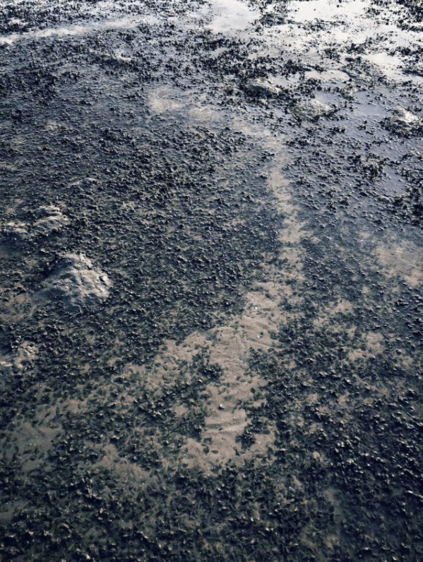 走近了才知道,原来我以为颇像水华的“漂浮物”,是长在沙地上的水草,那其实已经是退潮时近乎裸露的沙滩了。只有一层浅浅的海水覆盖这层海草。数量最多的是一种叶子短小的海草,那是儒艮的食物。
