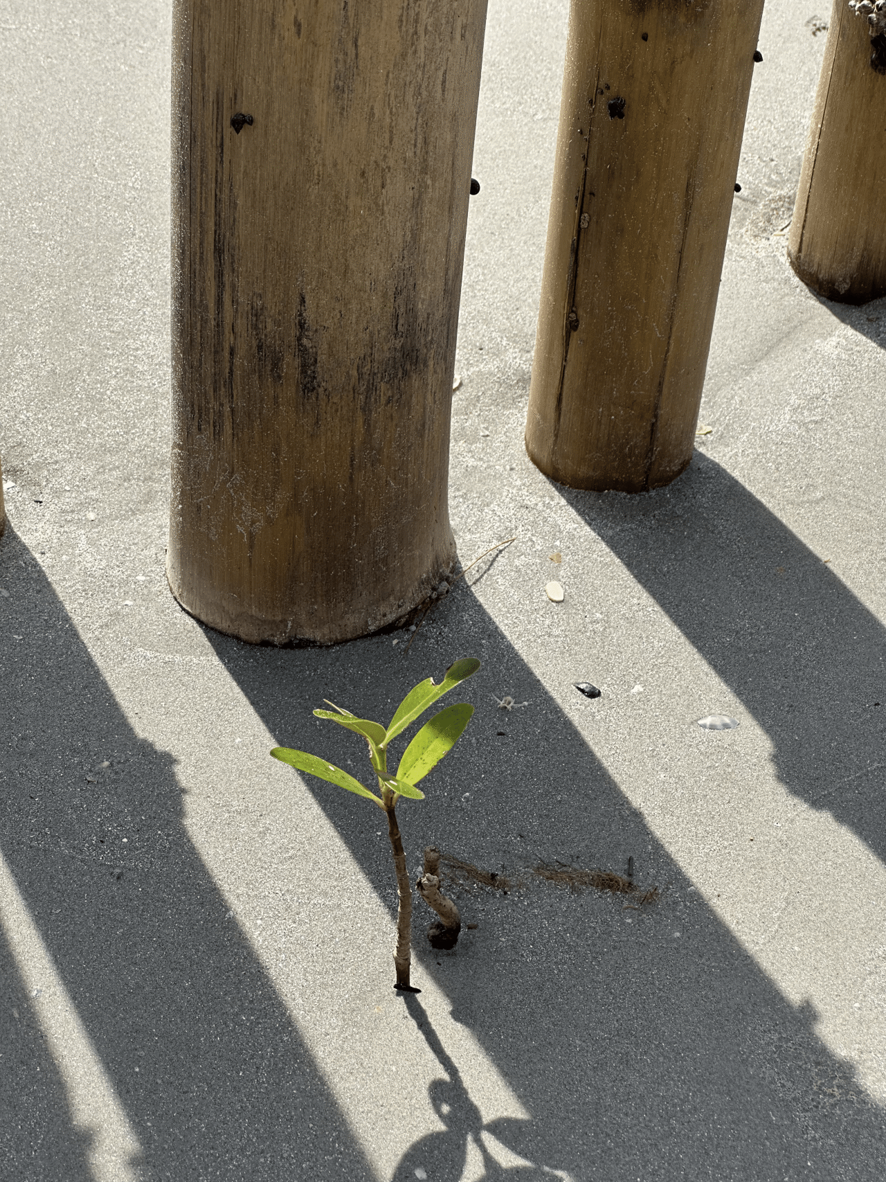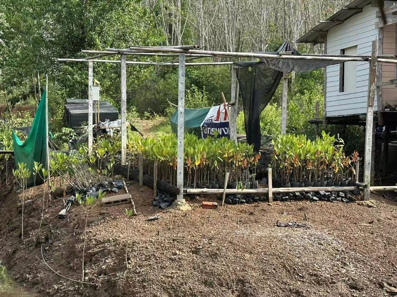 为了巩固来之不易的沙子,村民还在竹竿根部种下红树苗,据说3至4年可以长大。他们喜欢把几株种在一起,因为这样红树苗“和朋友一起长大,不孤单”。这是有科学依据的,在需要抗风浪的地区,2-3株紧靠种植,可利用幼苗间的相互缠绕来减少倒伏。