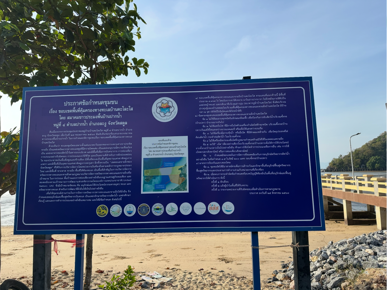我们交流时,就站在海边一块去年立下的蓝色标牌下方。这是一份社区保护地管理规则公告,确定了社区保护地的范围、禁止事项(如非法渔具)和惩罚措施等。牌子中间的地图区域全部属于国家公园,其中划出的黄色、橙色区域则分别是两个村子的社区保护地。